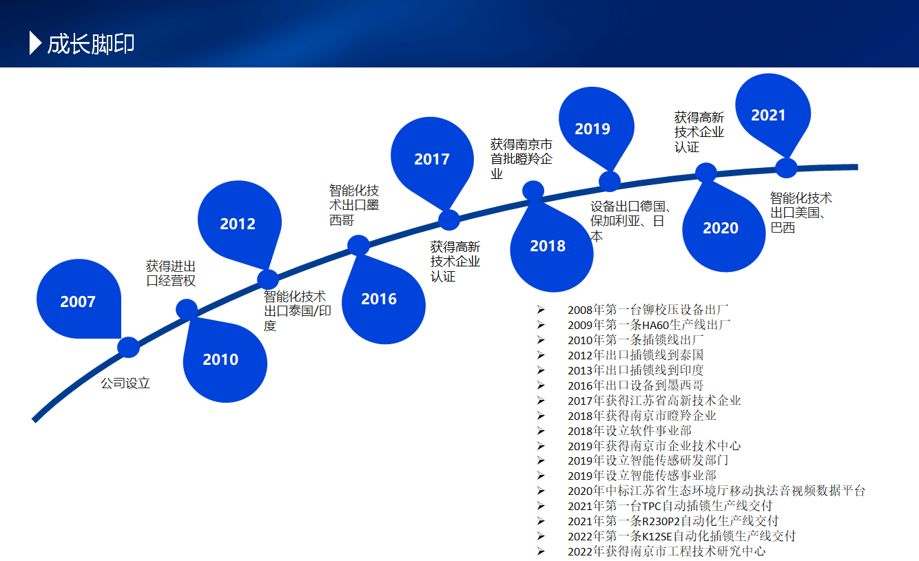 我司成立于2007年,在2008年第一台铆校压设备出厂,在09年第一条HA60生产线出厂。在2010年,公司获取了进出口经营权,同年,第一条插锁线出厂,至此,我司开始为出口设备努力研发,于2012年,我司将插锁线出口至泰国,正式开始设备出口出售,出口至泰国、印度、墨西哥等地。